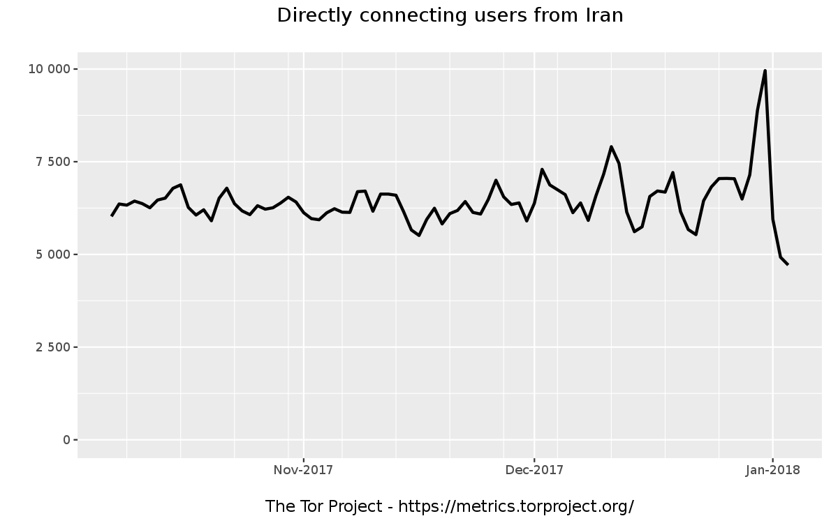 The Tor anonymity network is free software that allows its users to browse the web anonymously and to circumvent internet censorship. Tor Metrics (below) show a sudden spike in Tor usage on 31st December 2017, when ISPs started blocking access to Telegram and Instagram in Iran.