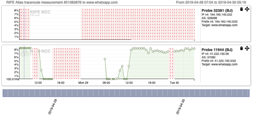 Since HTTP queries are only enabled on RIPE Atlas anchors (none of which are hosted in Benin), we launched traceroutes from all online RIPE Atlas probes in the country towards the landing webpages of social media, such as whatsapp.com, instagram.com, wechat.com, messenger.com, facebook.com. The measurements cover the period April 28, 2019 at 07:04 UTC to April 30, 2019 at 05:19 UTC. The results of these measurements reflect the connectivity on the IP/network layer (and not on the application layer) from the host Autonomous System (AS).