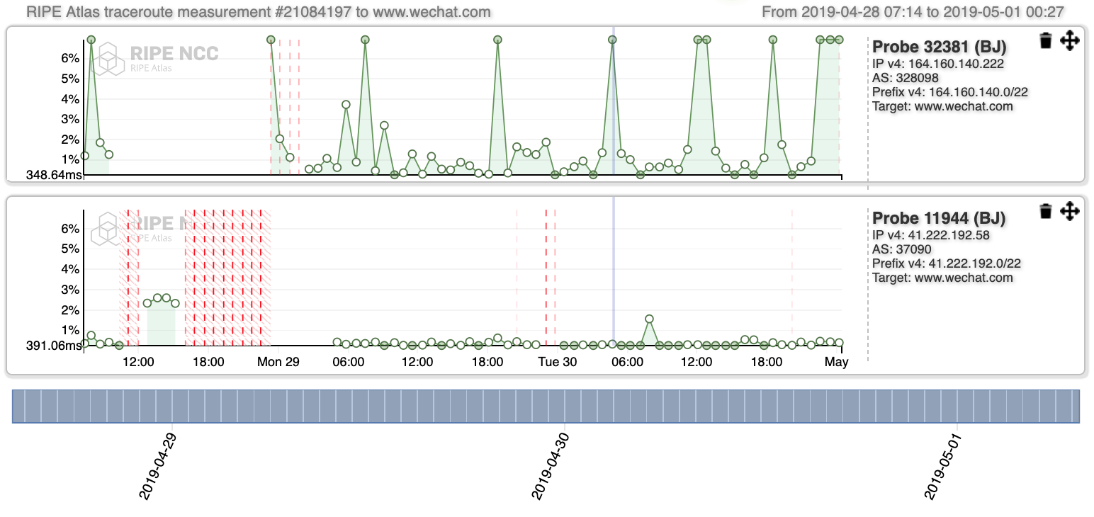 **Figure 7:**RIPE Atlas measurement, Recurring IPv4 traceroute measurement from all probes online in Benin to www.wechat.com, https://atlas.ripe.net/measurements/21084197/, April 28, 2019