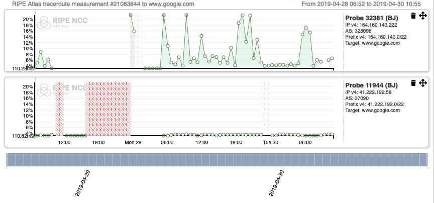 **Figure 9:**RIPE Atlas measurement, Recurring IPv4 traceroute measurement from all probes online in Benin to www.google.com, https://atlas.ripe.net/measurements/21083844/, April 28, 2019