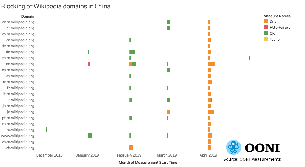 The following chart, based on OONI data, illustrates that multiple language editions of Wikipedia have been blocked in China as of April 2019.
