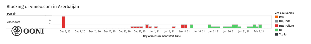 Chart: Blocking of vimeo.com in Azerbaijan between December 2020 to January 2021 based on OONI data.