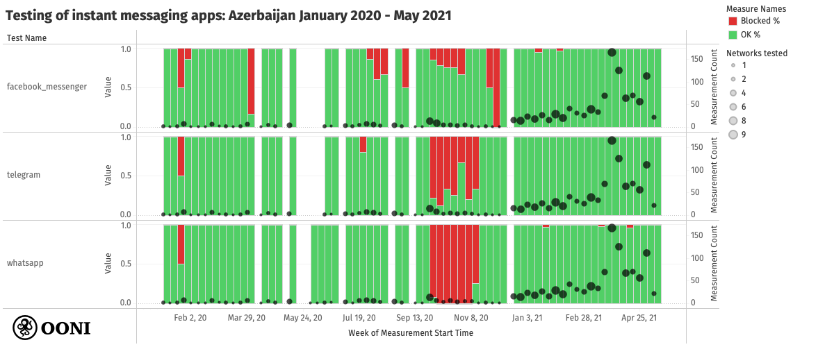 We also observe the potential blocking of instant messaging apps in Azerbaijan during the 2020 Nagorno-Karabakh war. The following chart aggregates OONI measurements collected from the testing of WhatsApp, Telegram, and Facebook Messenger (on up to 9 AS networks) in Azerbaijan between January 2020 to May 2021.