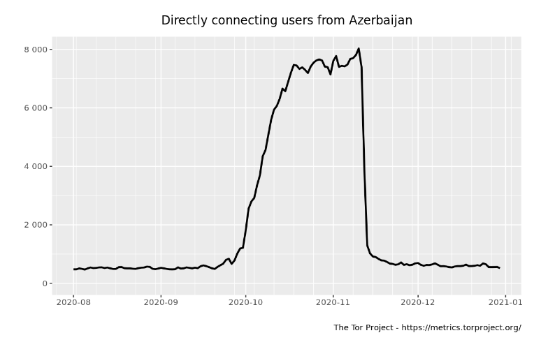 The hypothesis that the blocking attempt against Tor was ineffective is further suggested by Tor Metrics, which show a large spike in directly connecting Tor users from Azerbaijan during this period (amid the 2020 Nagorno-Karabakh war).