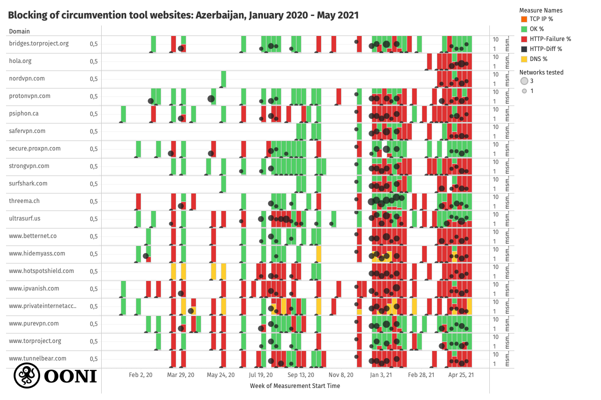 Numerous circumvention tool websites presented signs of potential blocking when tested (on up to 3 AS networks) in Azerbaijan between February 2020 to May 2021, as illustrated through the following chart.