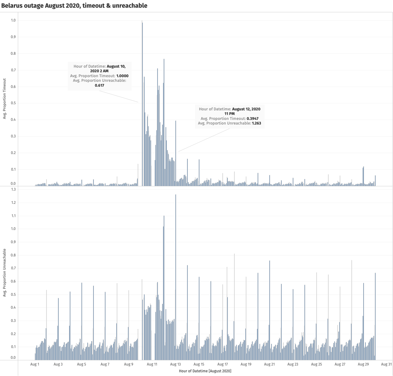 Source: Mozilla telemetry data from Belarus (August 2020): Custom charts showing the average proportion of connection timeouts and the average proportion of unreachable connections.