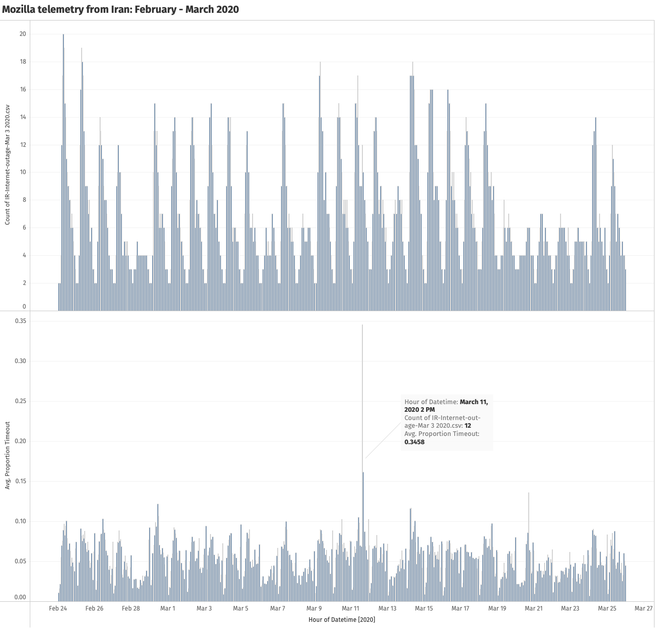 Source: Mozilla telemetry data from Iran (February to March 2020): Custom charts showing the number of distinct locations submitting telemetry data and average proportion of connection timeouts from Iran.