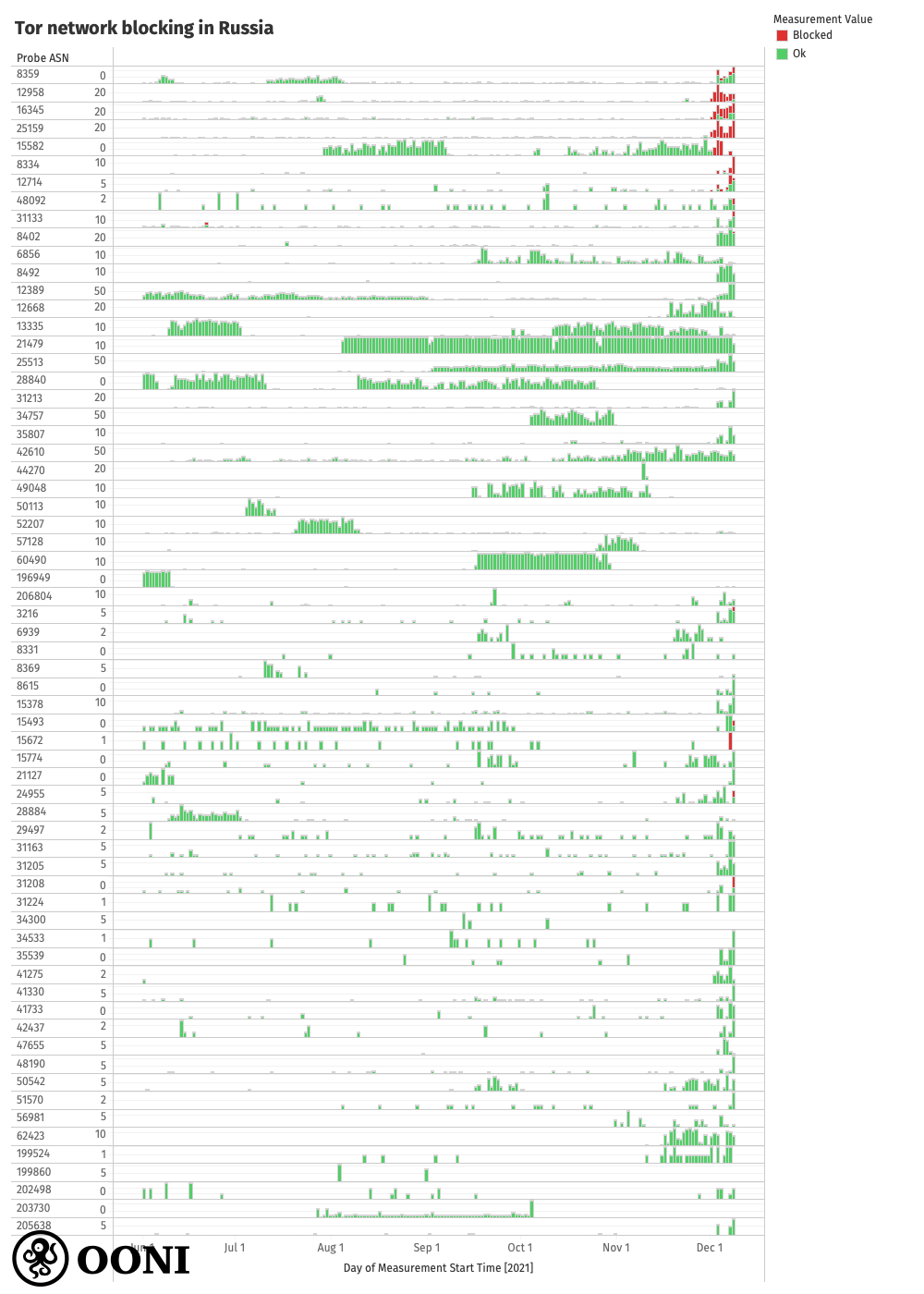 Source: OONI Probe Tor measurements collected from Russia between June 2021 to December 2021, https://explorer.ooni.org/search?since=2021-11-08&until=2021-12-09&failure=false&probe_cc=RU&test_name=tor