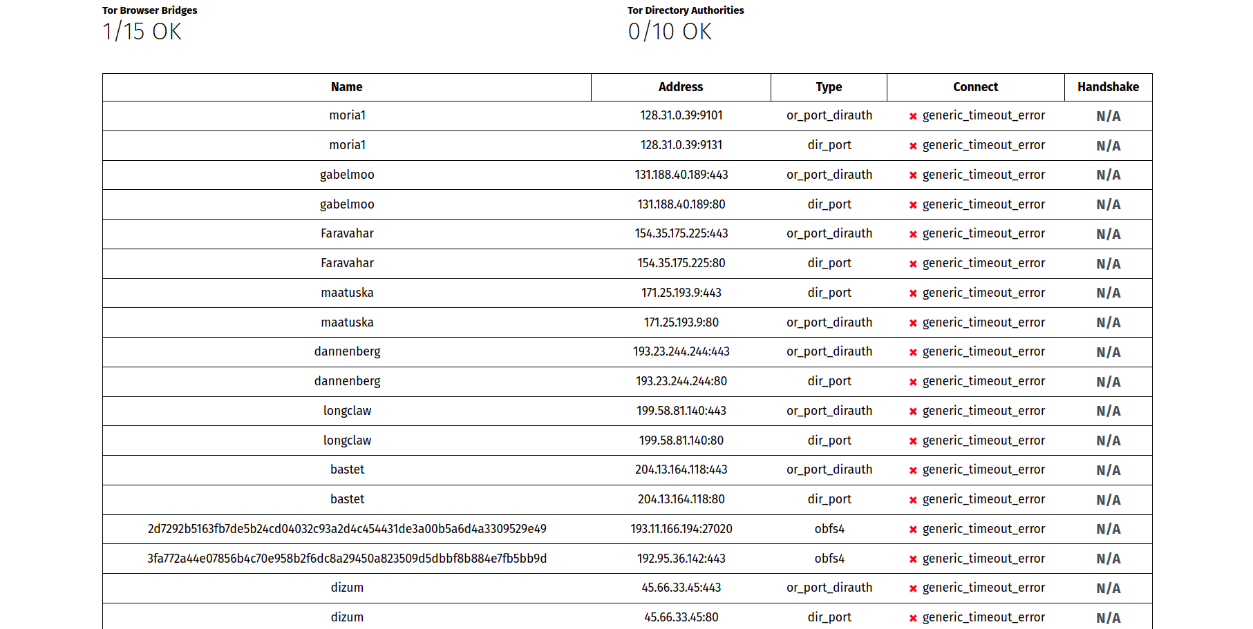 Based on our heuristics, if the test succeeds in performing all of the above, Tor may work on a tested network (unless it’s blocked in ways that aren’t being measured). In these cases, we automatically annotate Tor measurements as “OK”, indicating that Tor works on the tested network.
