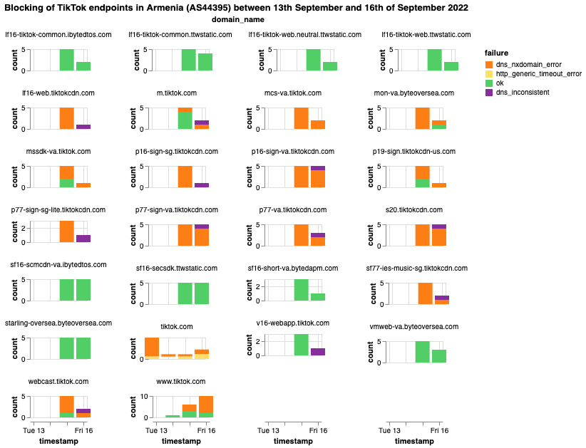 - Armenia has been blocking TikTok since at least 13th September 2022 on at least two networks (AS44395, AS43733);