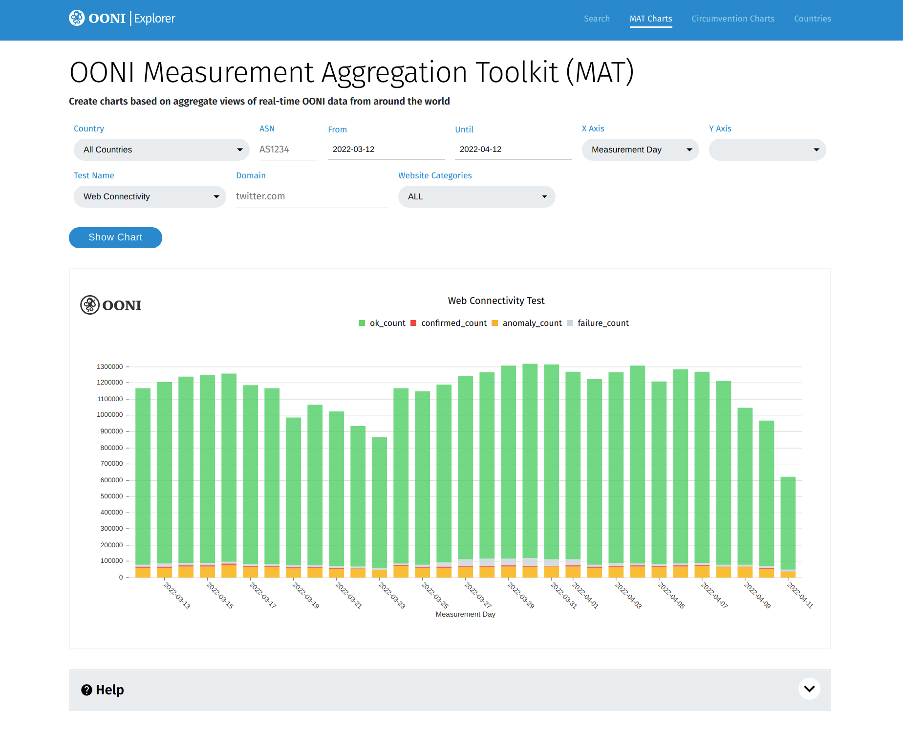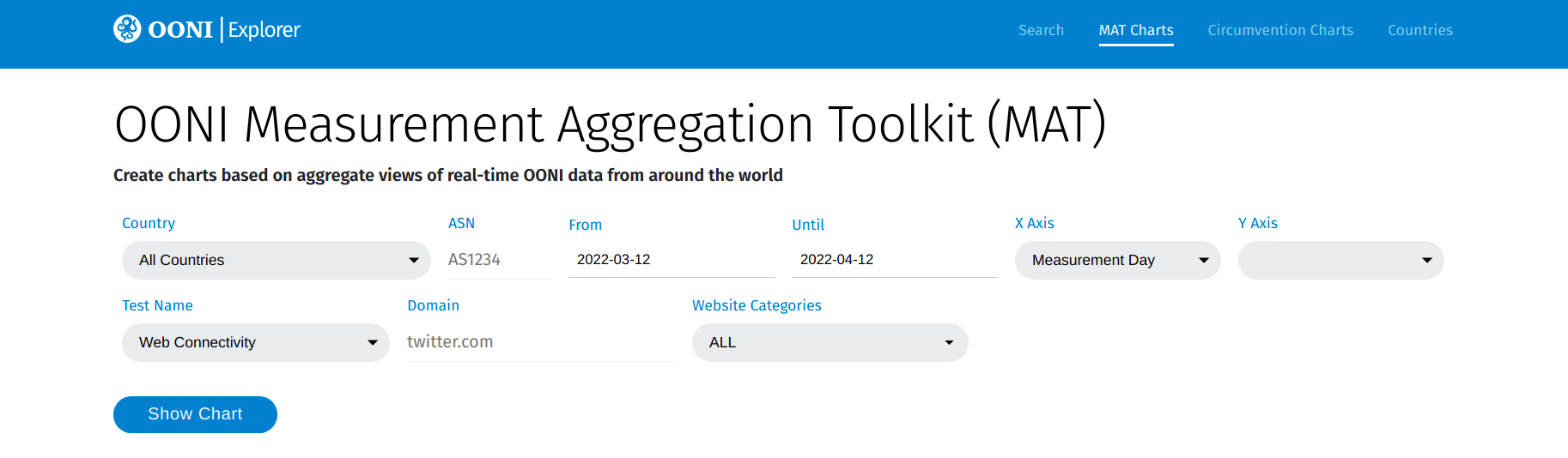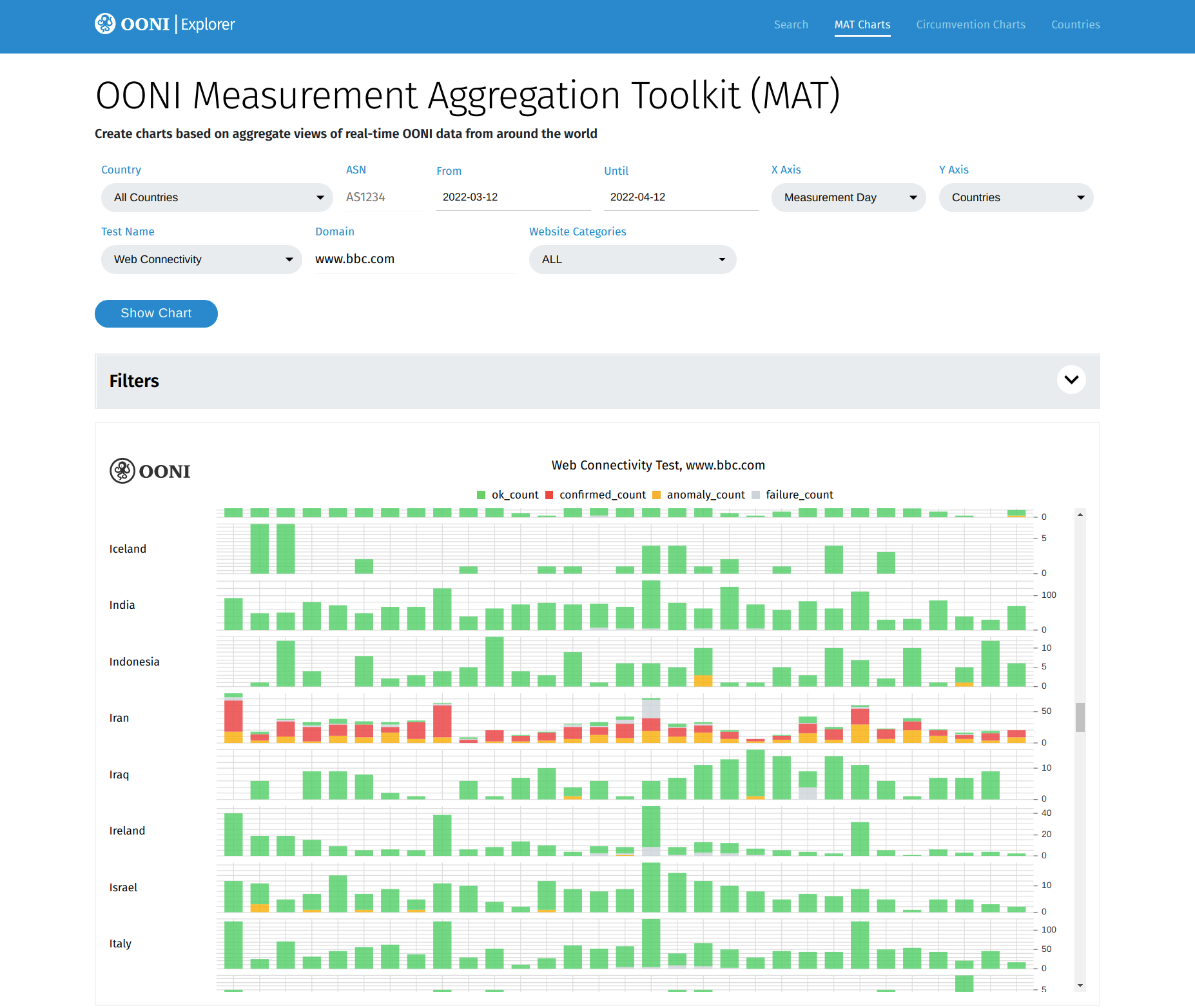 The MAT is a tool that enables you to create your own custom charts based on aggregate views of real-time OONI data collected from around the world.