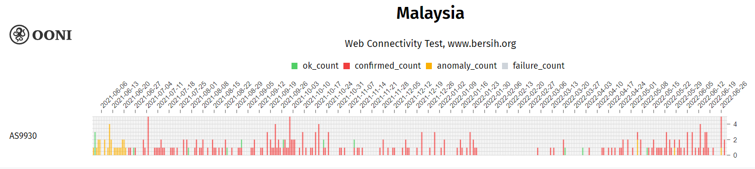 The Internet Monitoring Action Project (iMAP) aims to promote and defend Internet freedoms in South and Southeast Asia by pursuing the following interconnected objectives: (1) establish in-country networks that will monitor network interference and restrictions to the freedom of expression online; (2) promote legal advocacy to expand Internet freedoms; and (3) enable civil society action for a freer Internet. The purpose of the Internet Monitoring Action Project (iMAP) State of Internet Censorship Country Report is to understand whether and to what extent internet censorship events occurred through collection and analysis of network measurements in Malaysia during the testing period from 1 January 2022 to 30 June 2022.