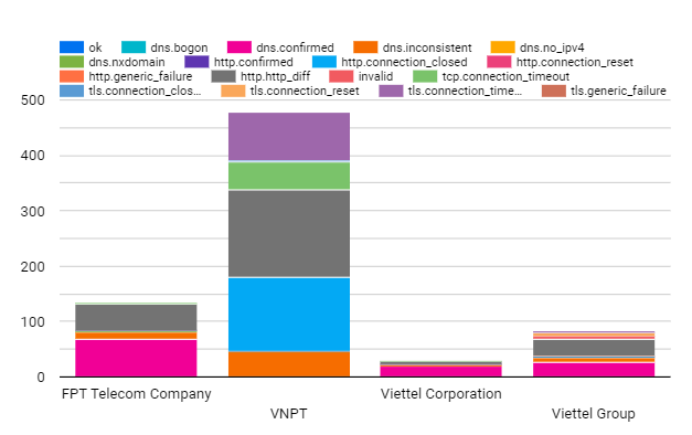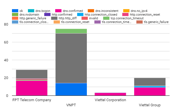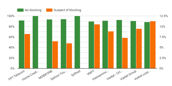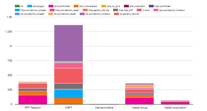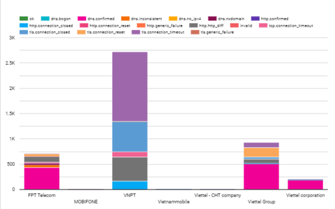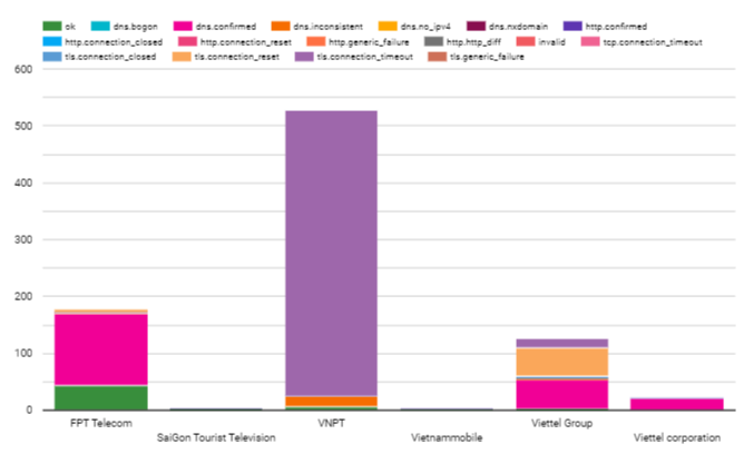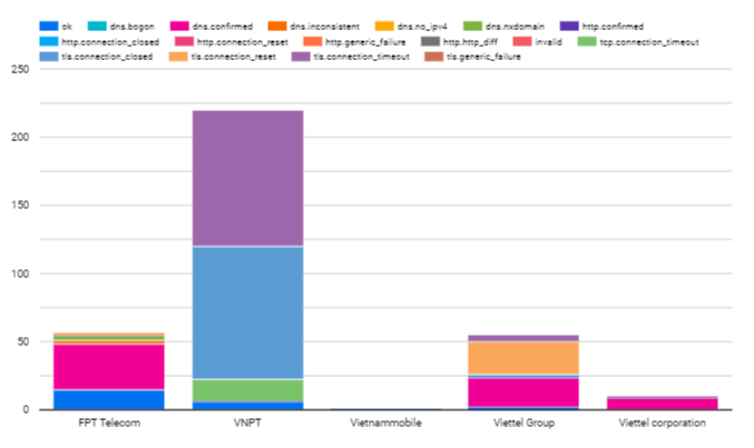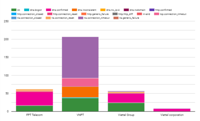 The raw data in this period from OONI included 301,847 tests. However, we have to filter and remove the ones that are untrusted. Normally tests of blocked sites will return a page with the same title. We counted 1108 blocked websites across 10 different networks of autonomous system number (ASN): of which 3 ASN’s networks belong to Viettel (Viettel CHT company, Viettel Group, Viettel Corporation), a military-owned internet service provider; 3 ASN’s networks of state-owned enterprises (VNPT, MOBIFONE, SaiGon Tourist); 1 foreign joint venture enterprise (Vietnammobile); 1 private-owned enterprise (FPT Telecom); 2 foreign enterprises (Home Credit Vietnam Finance, Softnet). Networks with suspicious signals that blocked users are networks that are heavily regulated by the government. There are 2 suppliers that do not block users who are foreign businesses. However, the number of tests is too small. So, it is impossible to confirm anything and it depends on the user to access which category is restricted by the government. The six main internet and mobile service providers of Vietnam blocked users; these are VNPT, Viettel, FPT, Saigon Tourist, MOBIFONE and Vietnam Mobile.
