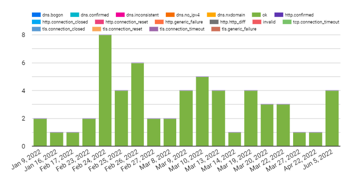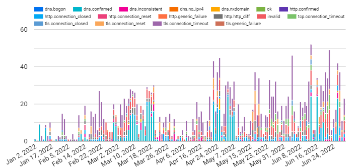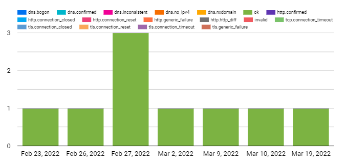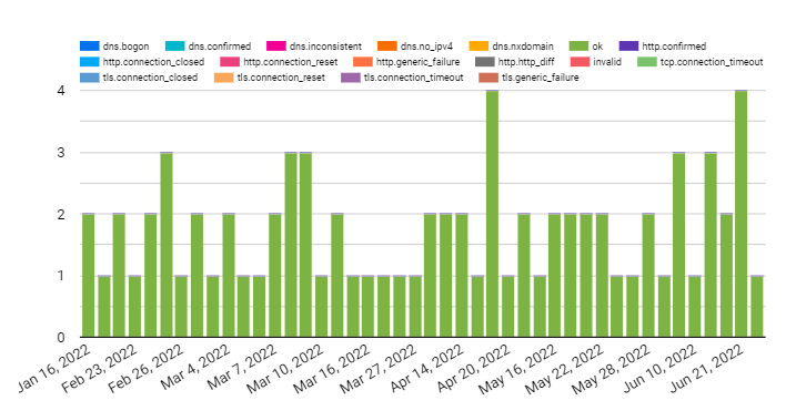 According to OONI, false positives may occur within the processed data due to a number of reasons. DNS resolvers (operated by Google or a local ISP) often provide users with IP addresses that are closest to them geographically. While this may appear to be a case of DNS tampering, it is actually done with the intention of providing users with faster access to websites. Similarly, false positives may emerge when tested websites serve different content depending on the country that the user is connecting from, or in the cases when websites return failures even though they are not tampered with.