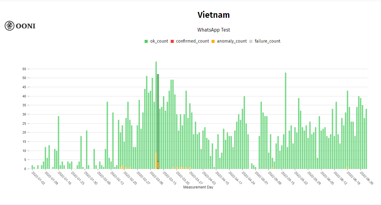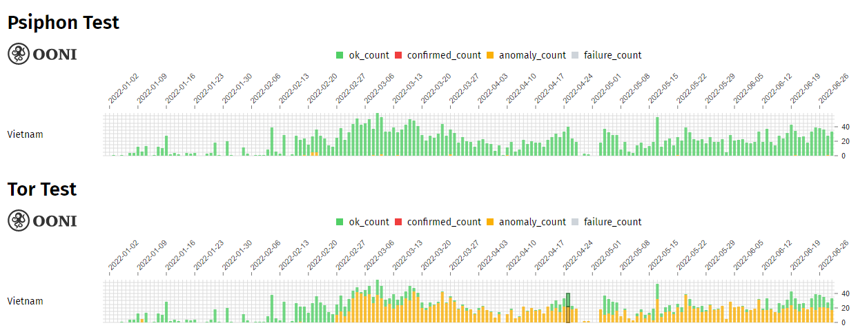Vietnam is one of the countries with the strictest surveillance in all aspects. Internet censorship is one of the government methods for national security. In the first half of 2022, more than 293,000 measurements (2054 URLs) were collected including global test list and country test list. The number of country test lists is over 500 URLs (corresponding to more than 60,000 measurements) based on the selected URL test list. Of these, more than 300 URLs have been reported as blocked or inaccessible, mostly with political and human rights websites. Freedom of speech and the press in Vietnam appear to be restricted without improvement. Independent news outlets such as BBC, CNN, RFA, RFI, VOA have also been blocked in the past. VPN tools have become very popular in the country.