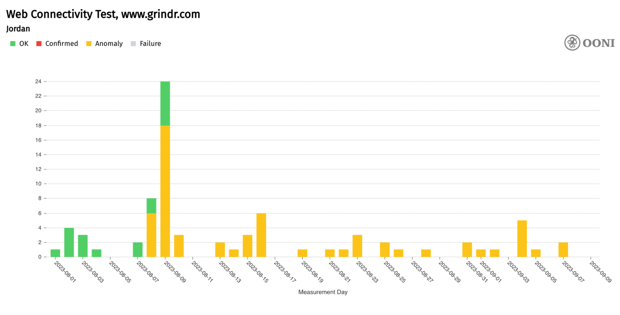 OONI network measurement data collected from Jordan suggests that ISPs started blocking access to Grindr on August 8th 2023, and that the block remains ongoing.
