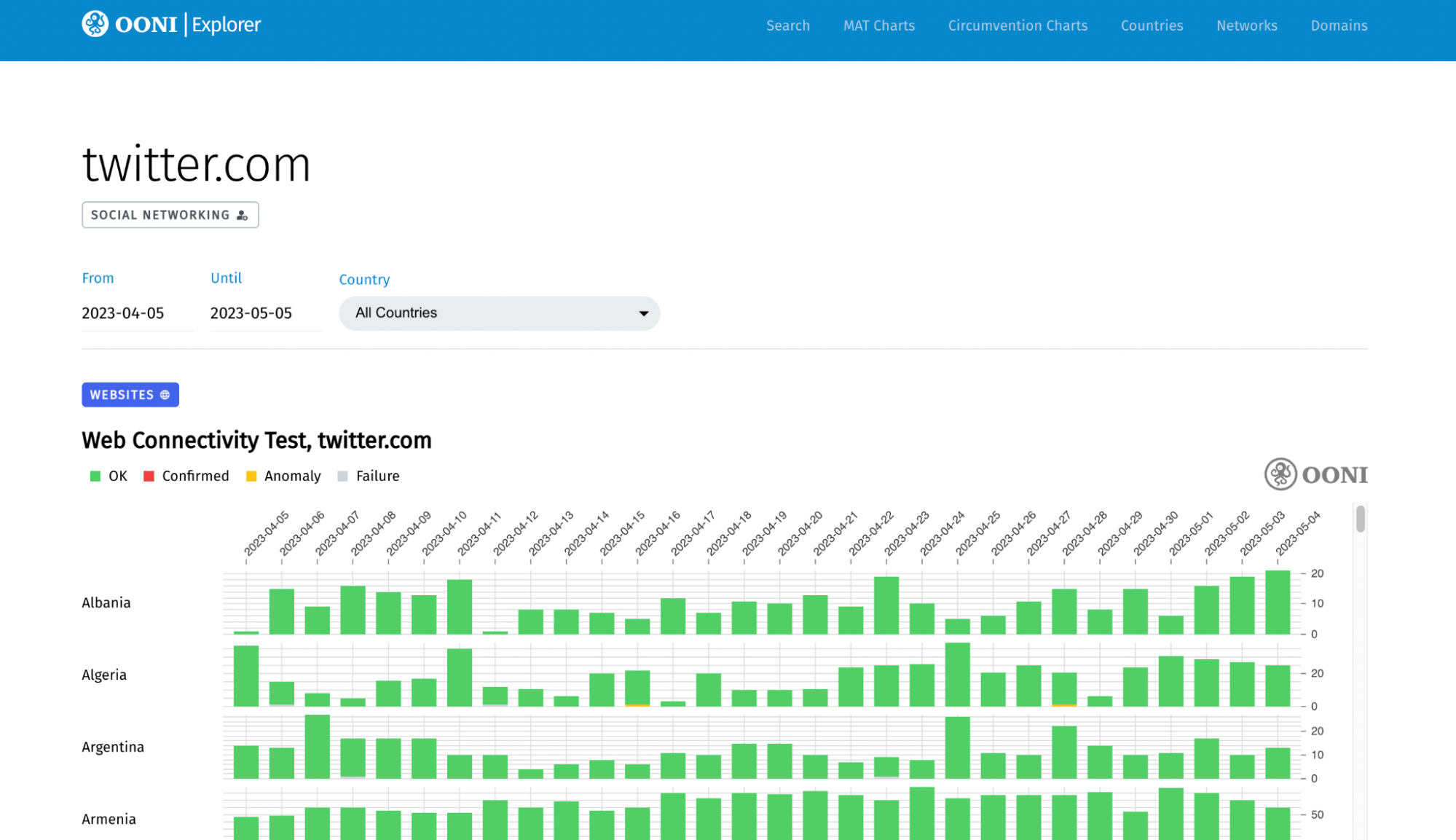 Image: OONI Explorer domain-centric page for twitter.com (source: OONI Explorer).