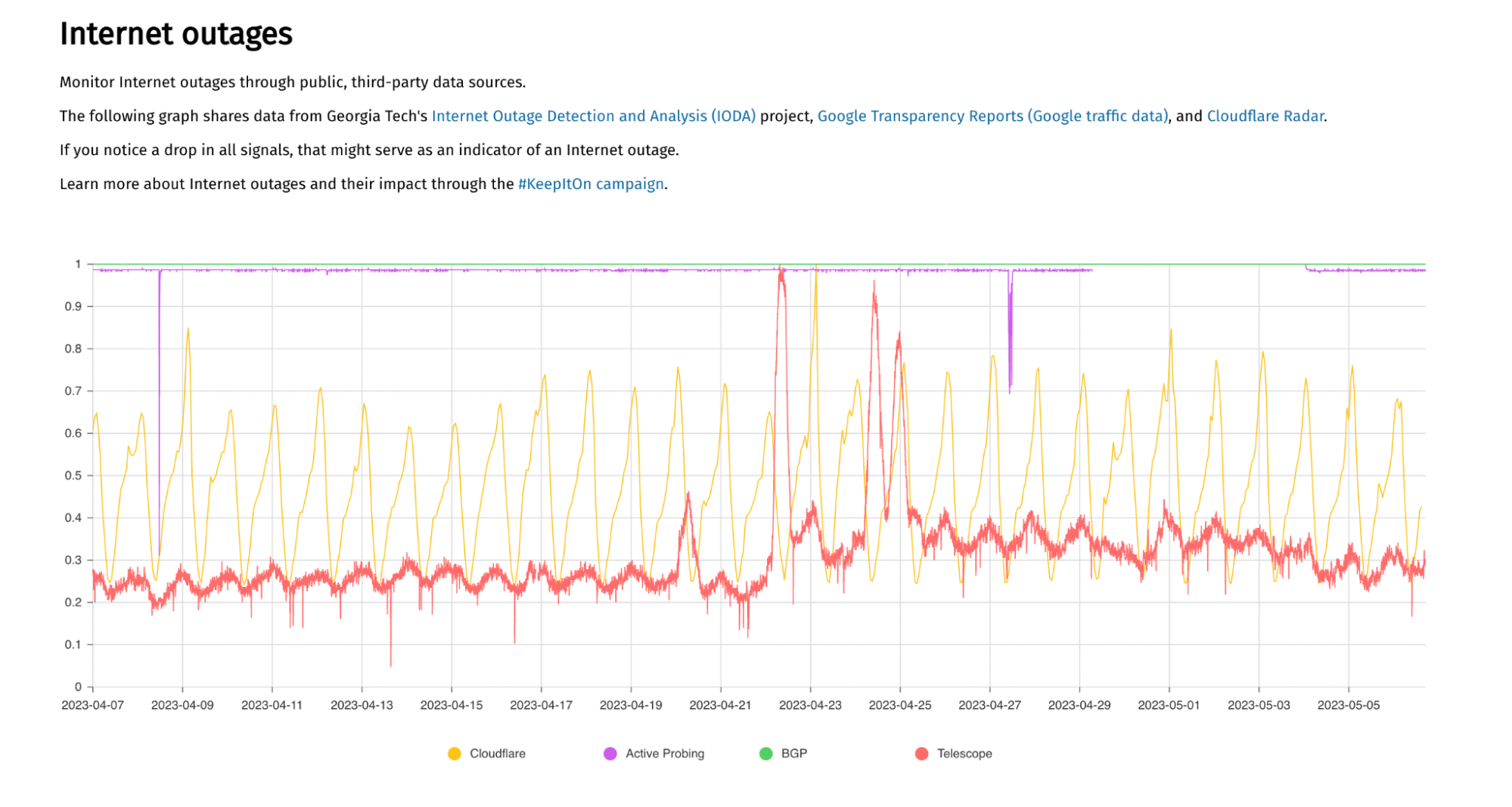 Blocks around the world often emerge before and/or after complete internet connectivity shutdowns (“internet outages”). When investigating internet outages, we refer to several third-party datasets that provide relevant signals: IODA, Google traffic, and Cloudflare Radar data. We refer to these datasets because they’re public and they each provide important (and complementary to each other) insight on internet outages around the world.