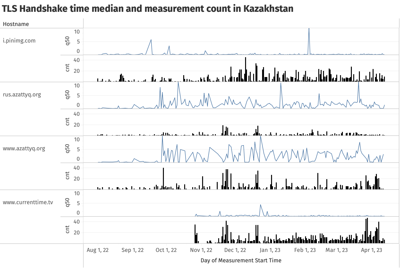The above chart represents the daily median TLS handshake time value with the number of datapoints used to calculate it overlayed. From the chart, it is evident that access to the domain www.azattyq.org has been throttled since 27th September 2022 and continues to be throttled until at least early April 2023. Similarly, we observe that the daily median TLS handshake time value for the Russian version of the site (rus.azattyq.org) significantly increased throughout this period as well.