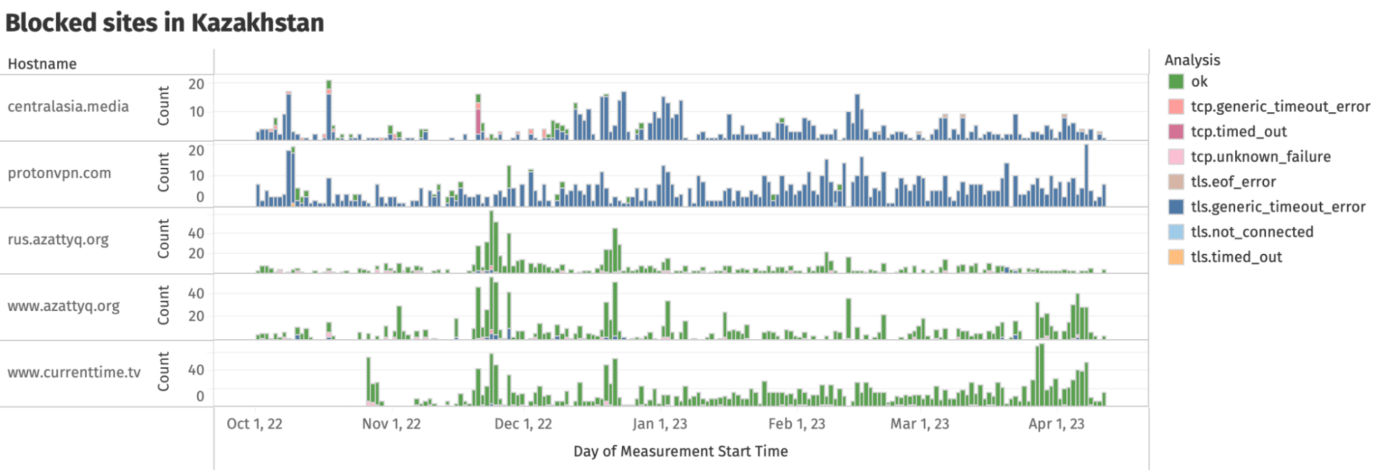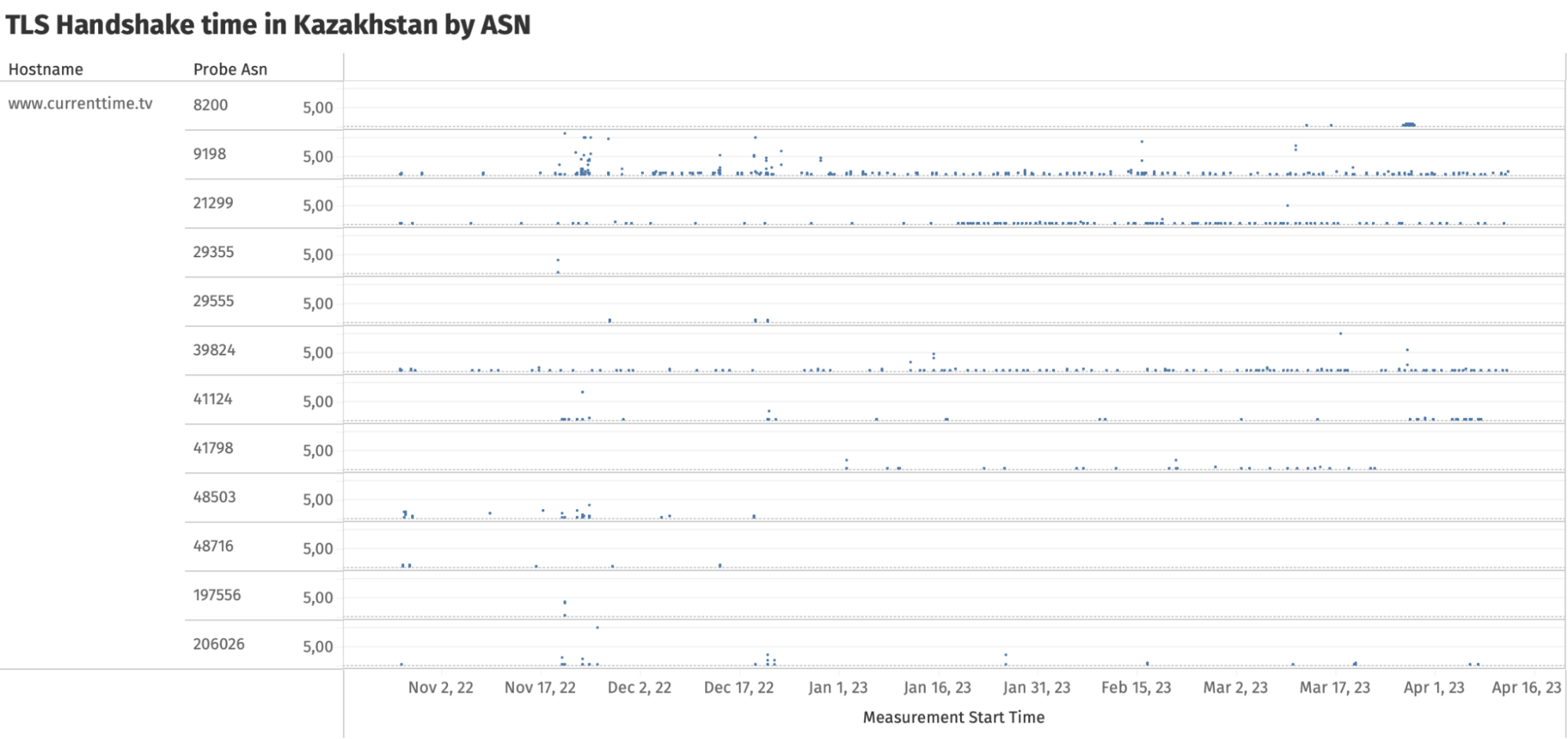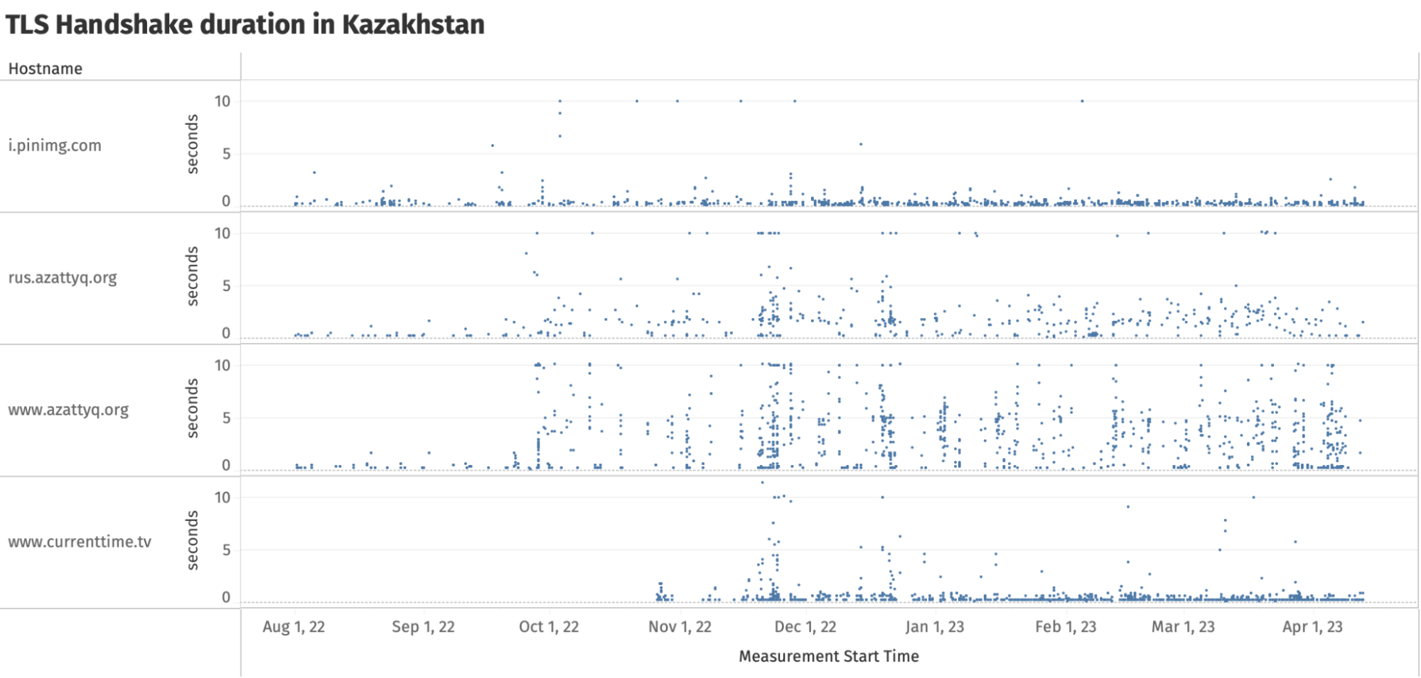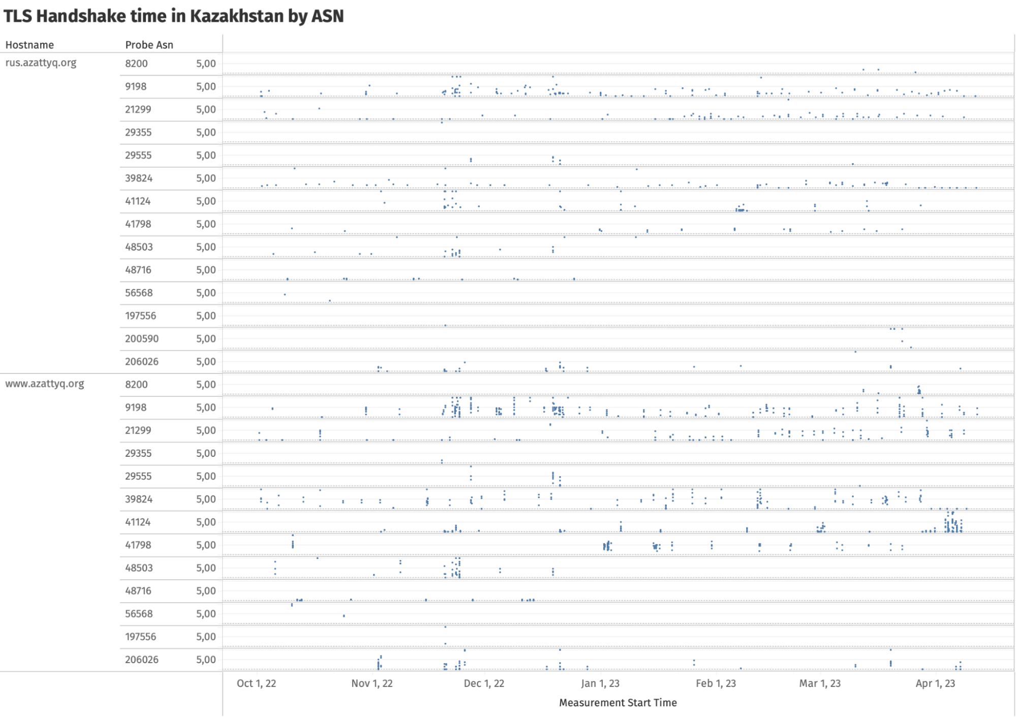In the above chart, we observe that ISPs in Kazakhstan block access to protonvpn.com and centralasia.media by timing out the entire TLS handshake. But in the cases of www.azattyq.org, rus.azattyq.org and www.currenttime.tv , the TLS handshakes are usually successful (which is why those measurements are annotated as “ok” in the chart), but with significant delays.