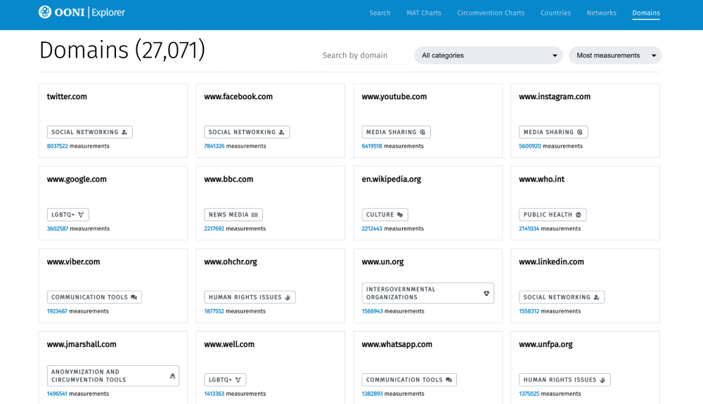 If you are a website owner, you may find the domain-centric pages particularly useful for tracking the accessibility (and blocking) of your website around the world (if your website is included in test lists). Researchers and advocates can also benefit from tracking the blocking of specific domains through these new pages.