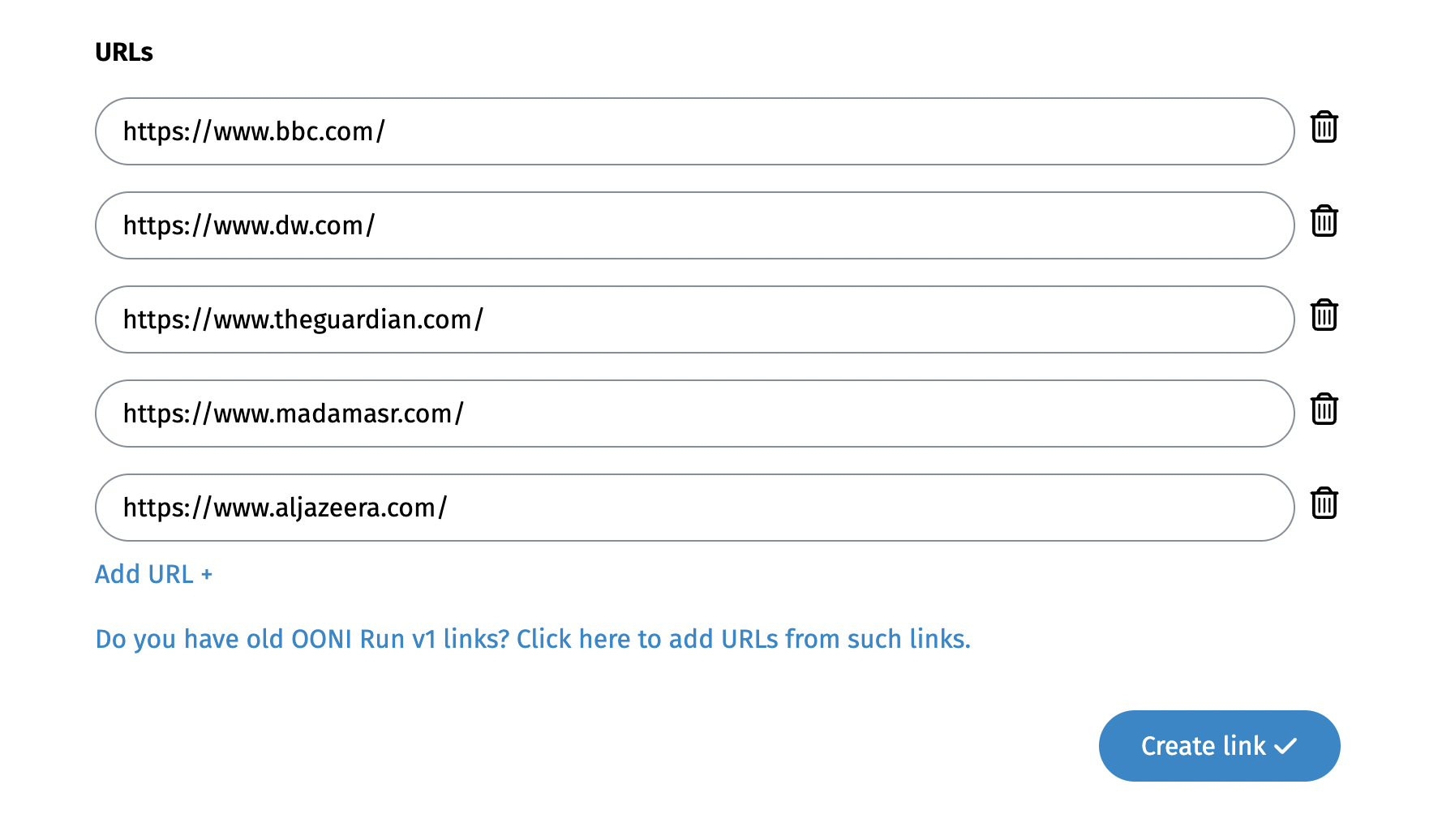 Step 6. Click Create Link to create a new OONI Run v2 link based on the URLs of your old OONI Run v1 link.