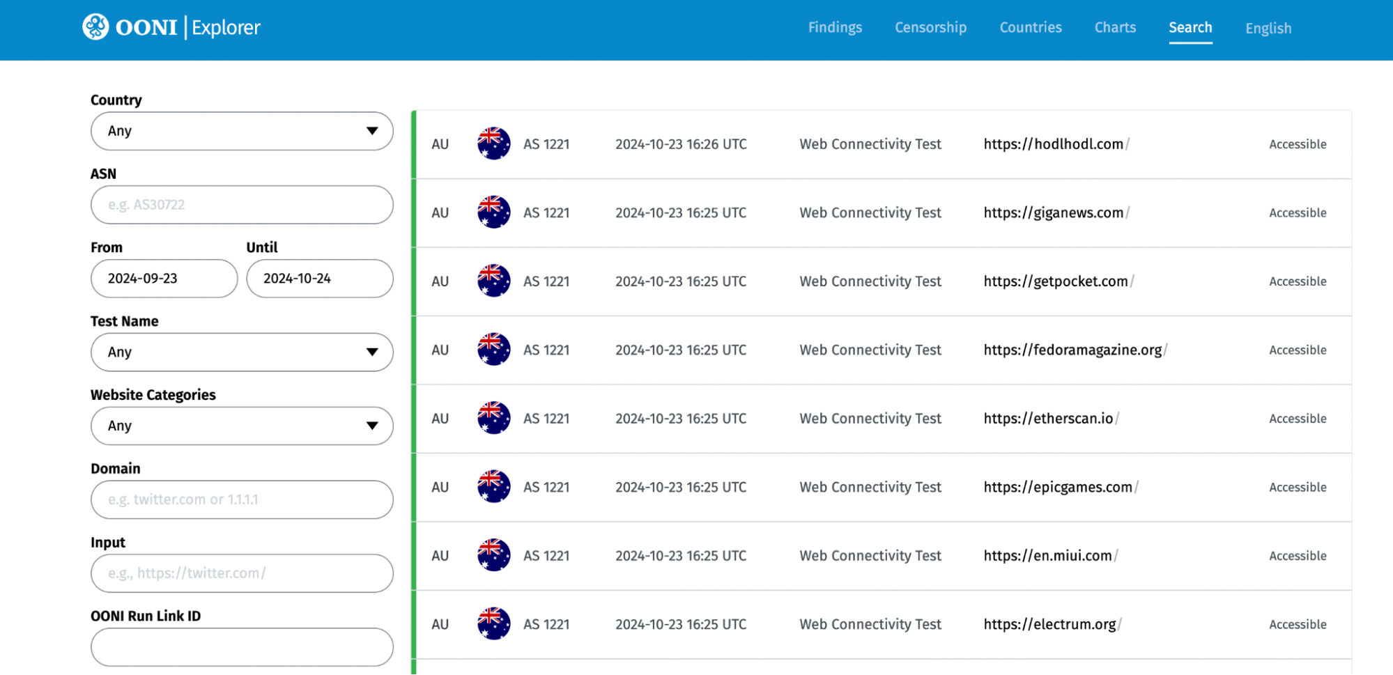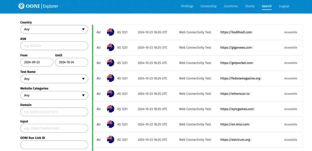 Step 1. Access the OONI Explorer Search Tool: https://explorer.ooni.org/search