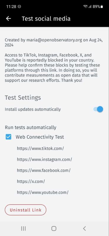If you would like to remove the OONI Run link card from your OONI Probe app, tap the “Uninstall Link” button.