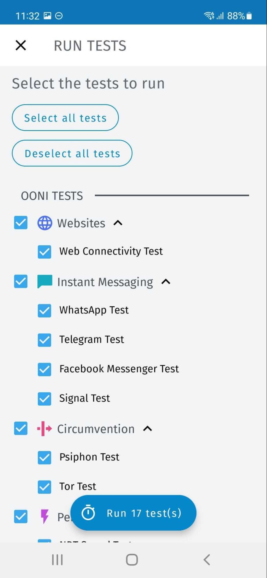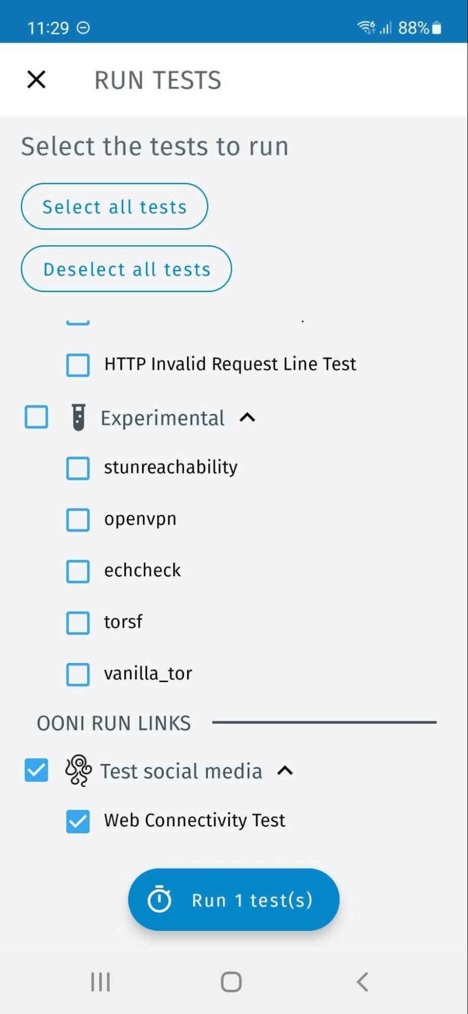 In the event that you have disabled automated OONI Run link testing and would like to manually test websites included in your OONI Run link, you can do so by tapping the main “Run” button in the OONI Probe Dashboard, tapping the “Deselect all tests” button (to deselect all other OONI Probe tests), and by only enabling the OONI Run link test.
