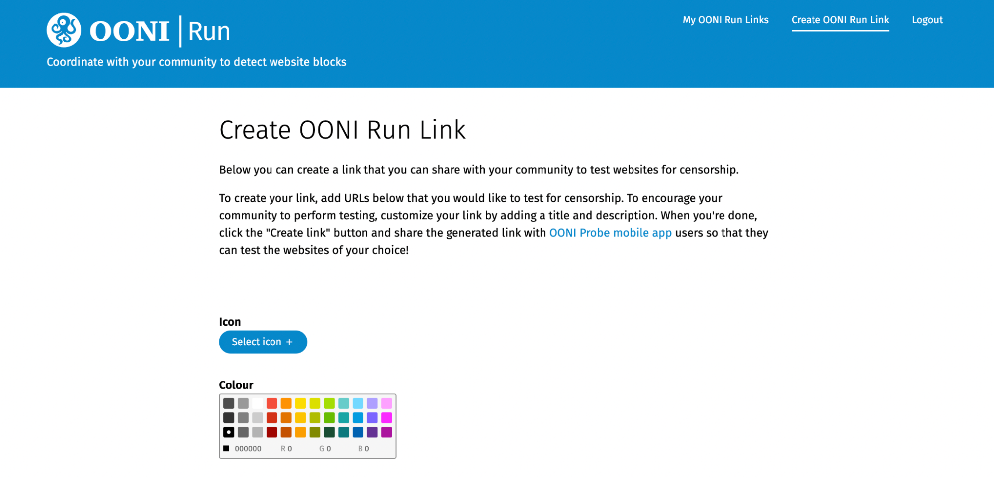 Optionally, you can customize your OONI Run link by selecting an icon and/or colour. Scroll down the page to fill out the required data fields.