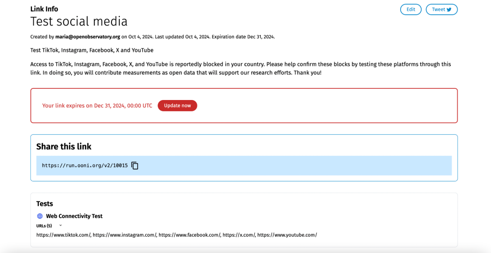 Community members often share OONI Run links on Twitter/X when they want to encourage more widespread testing.