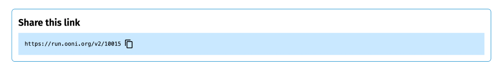 Step 13. To share your OONI Run link, click the copy icon next to your OONI Run link in the “Share this link” section. Then share the copied link with OONI Probe users who you would like to perform testing.
