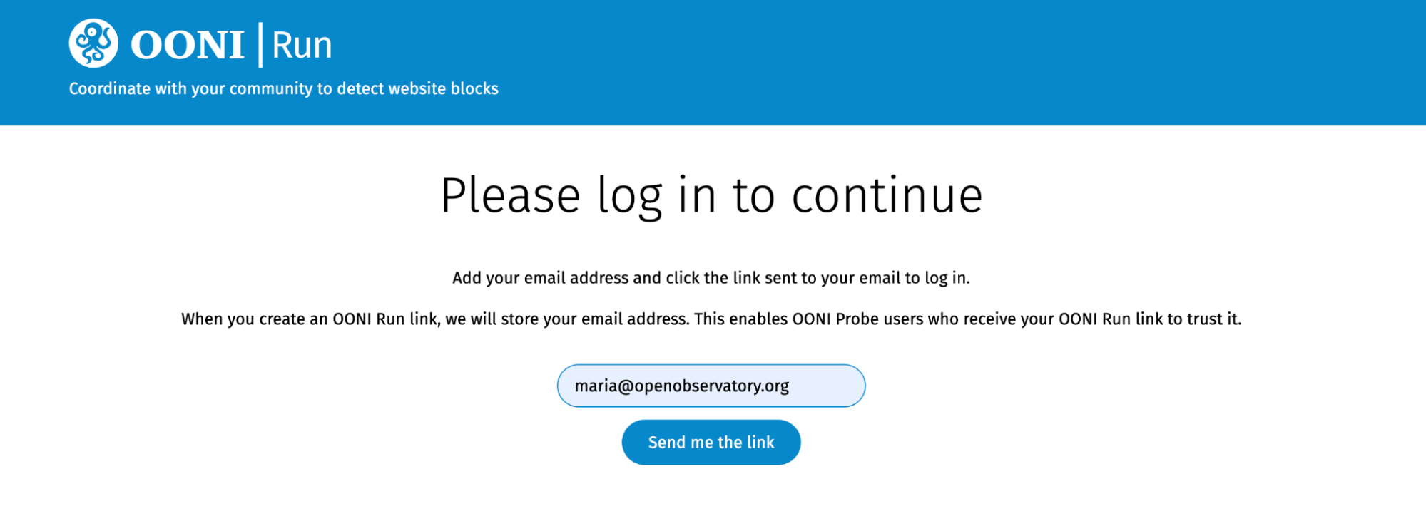 Note: We do not store email addresses when you log in, but only when you create an OONI Run link. We store your email address so that when OONI Probe users receive an OONI Run link from you, they can trust it based on your email address (which is displayed in the OONI Run link you create). This can help reduce the risk of running malicious links.