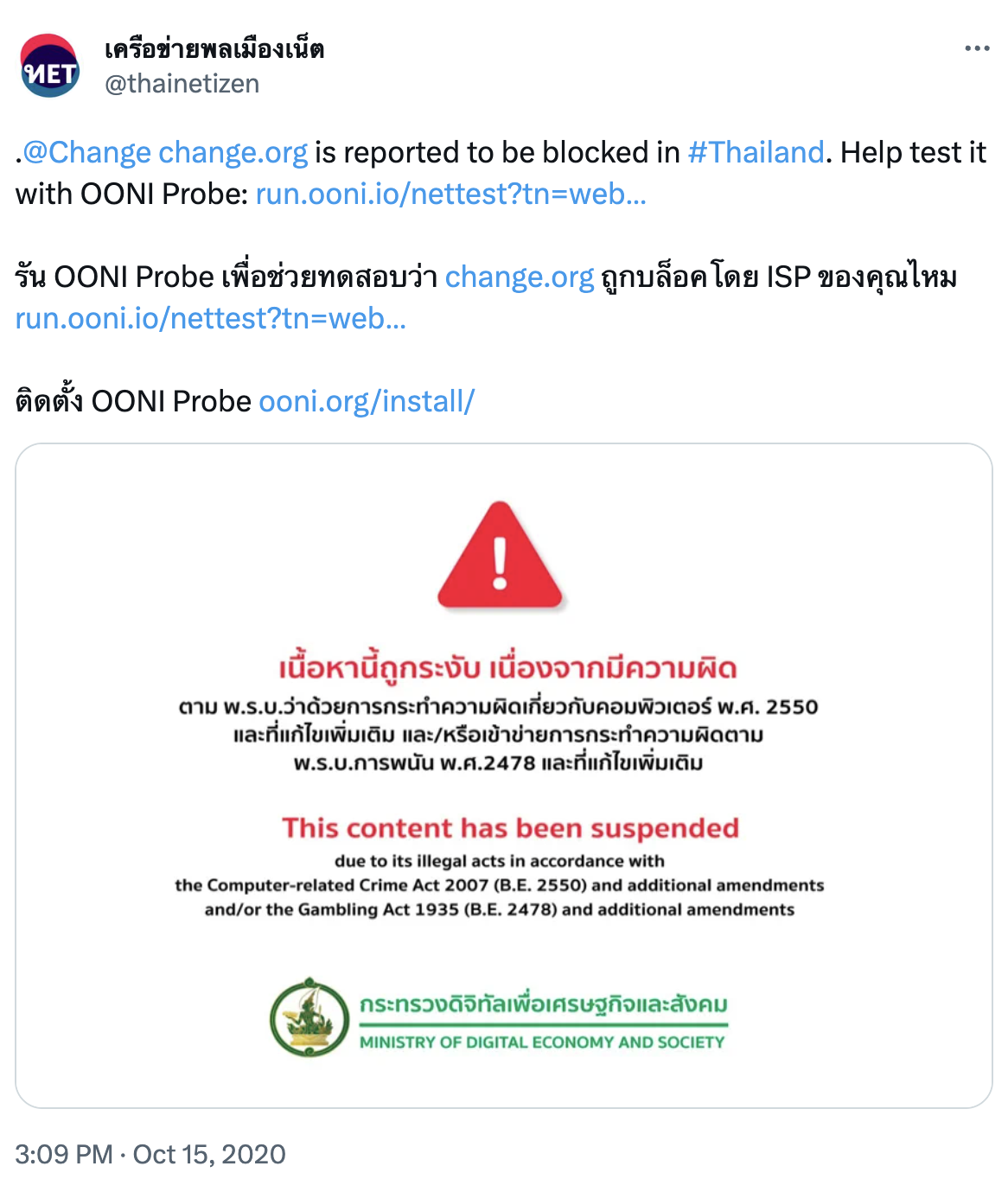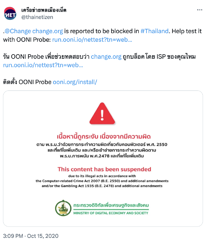 Image: Tweet by Thai Netizen Network sharing an OONI Run link for the testing of Change.org in Thailand.