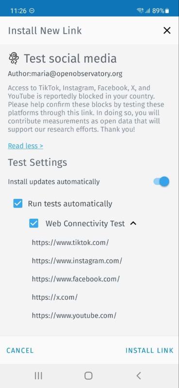 Step 3. To test the websites included in the OONI Run link, tap Install Link in the bottom right corner of the screen. This will install the OONI Run link in your OONI Probe mobile app, enabling you to change your OONI Run link settings and to uninstall the OONI Run link at any time.