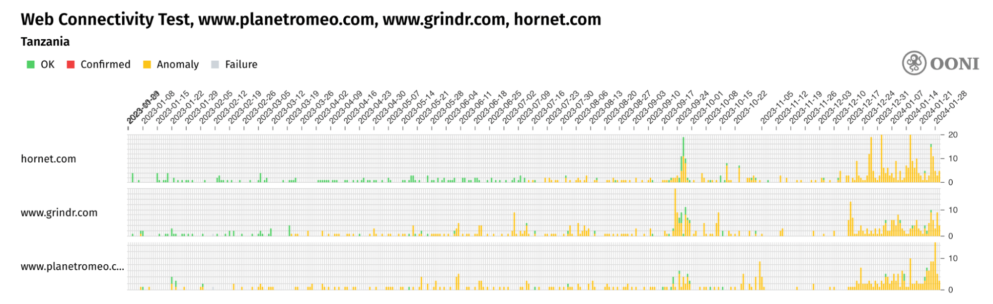 OONI data collected from Tanzania suggests that access to at least 3 LGBTIQ social networking sites is blocked, starting from early 2023. Specifically, OONI data shows that access to Grindr (www.grindr.com), Romeo (www.planetromeo.com), and Hornet (hornet.com) is blocked.