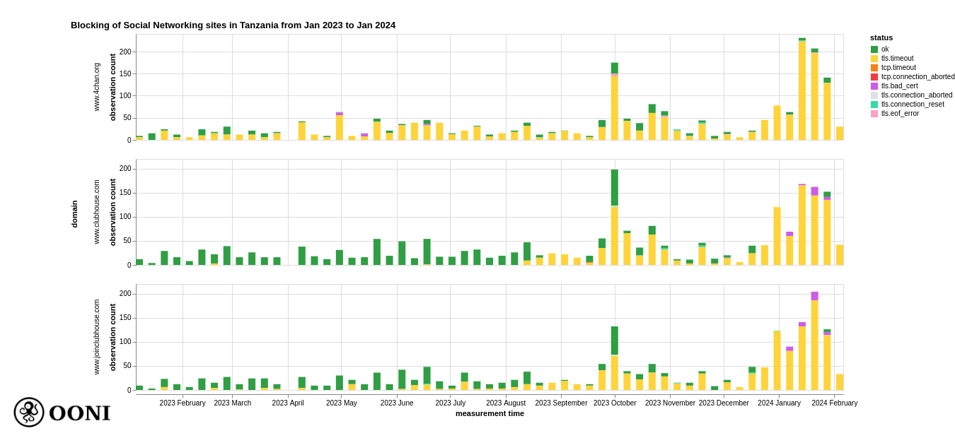 We produced the following chart based on our analysis of OONI measurements collected from the testing of www.clubhouse.com, www.joinclubhouse.com, and www.4chan.org in Tanzania between January 2023 to January 2024. The chart provides a weekly aggregation of measurements (collected from multiple networks in Tanzania) with annotations of results.