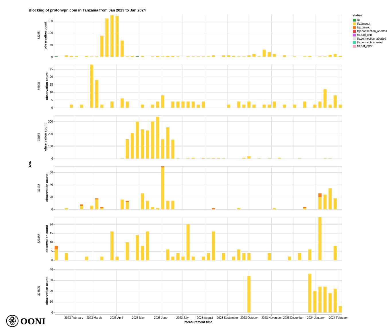 We have limited the above chart to the ASNs which received the largest measurement coverage during the analysis period. As is evident, we observe the same TLS handshake timeout errors in almost all measurements collected from the testing of protonvpn.com on (at least) six ASNs between January 2023 to January 2024. This not only provides a strong signal of blocking, but also suggests that ISPs in Tanzania implement blocks using the same censorship techniques (similarly to the findings for other blocked URLs, as discussed previously in this study).