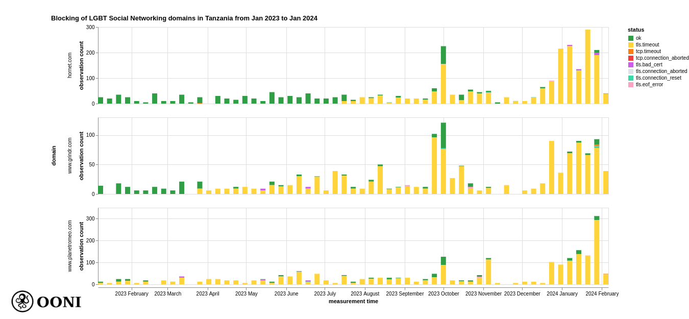 It’s worth highlighting that while OONI data suggests that these domains were previously accessible (annotated in green as “OK” in the above chart), most of the domains in the above chart started to present signs of TLS interference between February 2023 to March 2023. This coincides with the timing of the Grindr block (which appears to have started on 21st March 2023, according to OONI data), suggesting that ISPs in Tanzania may have received orders to block (more) LGBTIQ sites around that time.