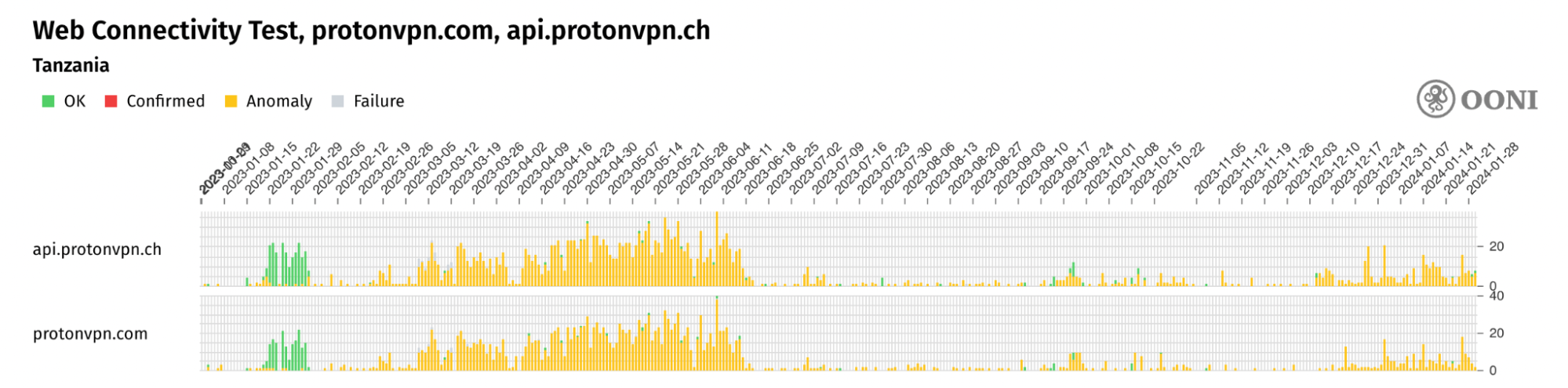 OONI data only indicates that access to ProtonVPN was blocked in Tanzania during the analysis period. Specifically, OONI data shows that most measurements from the testing of protonvpn.com and api.protonvpn.ch presented anomalies, as illustrated below.
