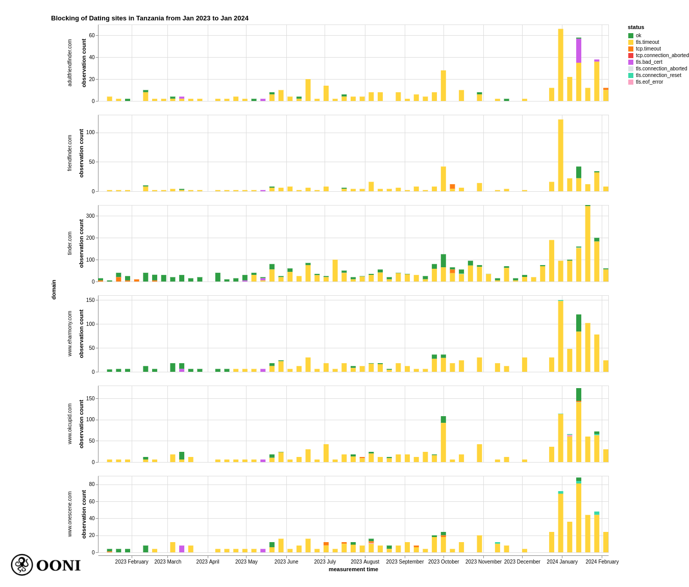 Chart: Blocking of online dating websites in Tanzania between 1st January 2023 to 31st January 2024 (source: ooni/data tool).