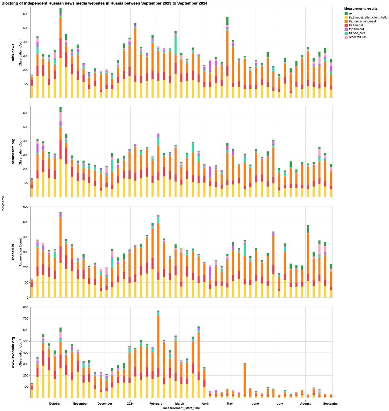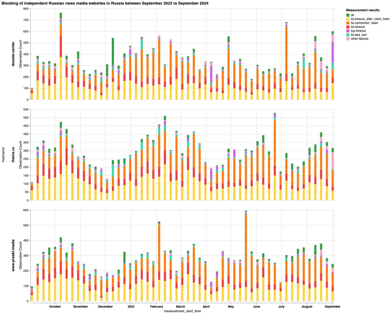 В частности, чтобы выяснить, какие сайты независимых российских новостных СМИ блокируются в России и какие методы цензуры применяют интернет-провайдеры, мы проанализировали данные сетевых измерений OONI, собранные в России за последний год (с 1 сентября 2023 года по 1 сентября 2024 года). Чтобы изучить влияние этих блокировок, мы опросили 15 независимых российских новостных СМИ. Мы также проанализировали список сайтов Citizen Lab для России и обновили его, включив в него дополнительные сайты независимых российских новостных СМИ для тестирования OONI Probe. Более подробная информация представлена ниже.
