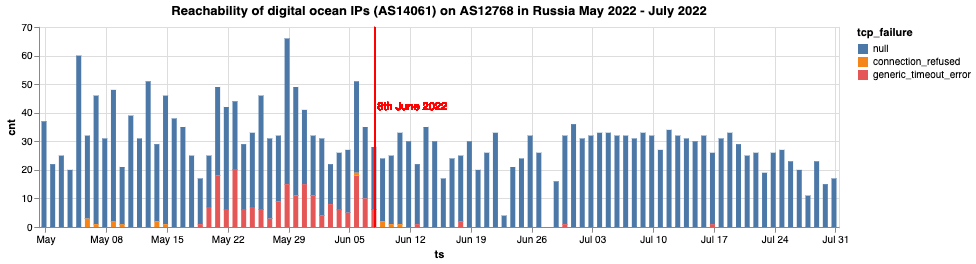 Поэтому мы агрегировали ошибки, чтобы определить, является ли большой процент аномальных измерений для тестируемой ссылки одинаковой ошибкой (например, «tls_timeout_error») по сравнению с общим объемом измерений в конкретной сети в определенном диапазоне дат. Чем выше соотношение одинаковых ошибок (от аномальных измерений) по сравнению с общим количеством измерений, тем сильнее сигнал (и тем выше наша уверенность), что доступ к тестируемому домену (а) заблокирован, и (б) заблокирован определенным образом (например, в рамках TLS-рукопожатия).