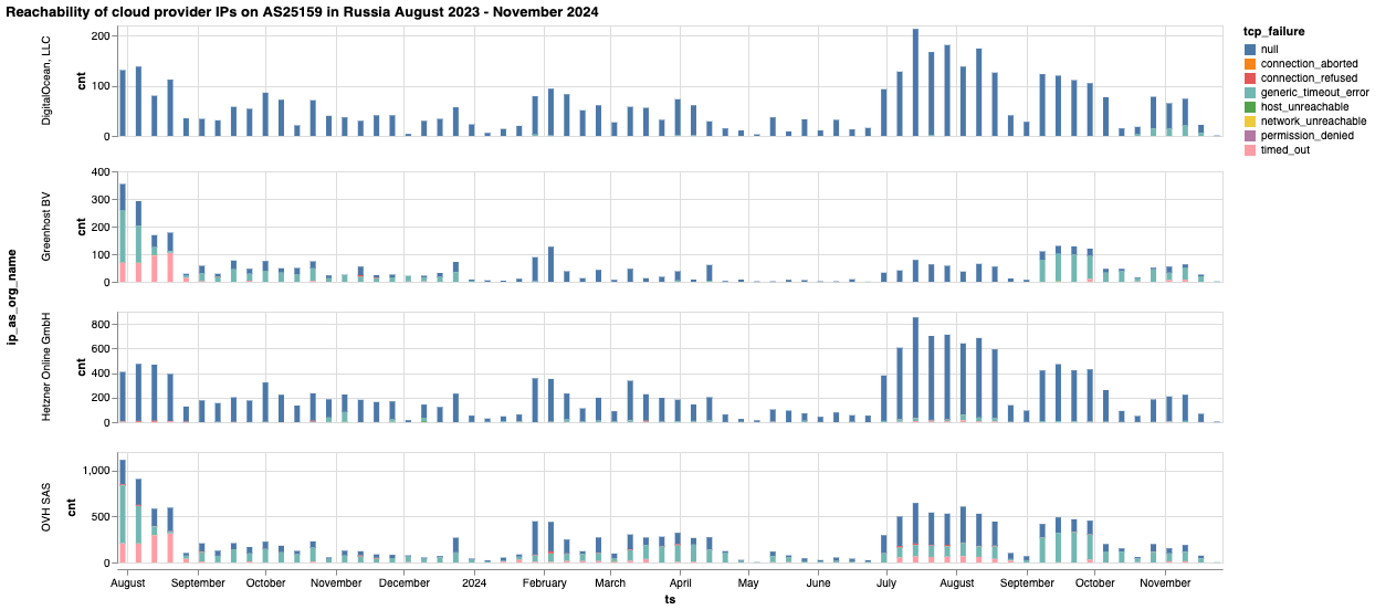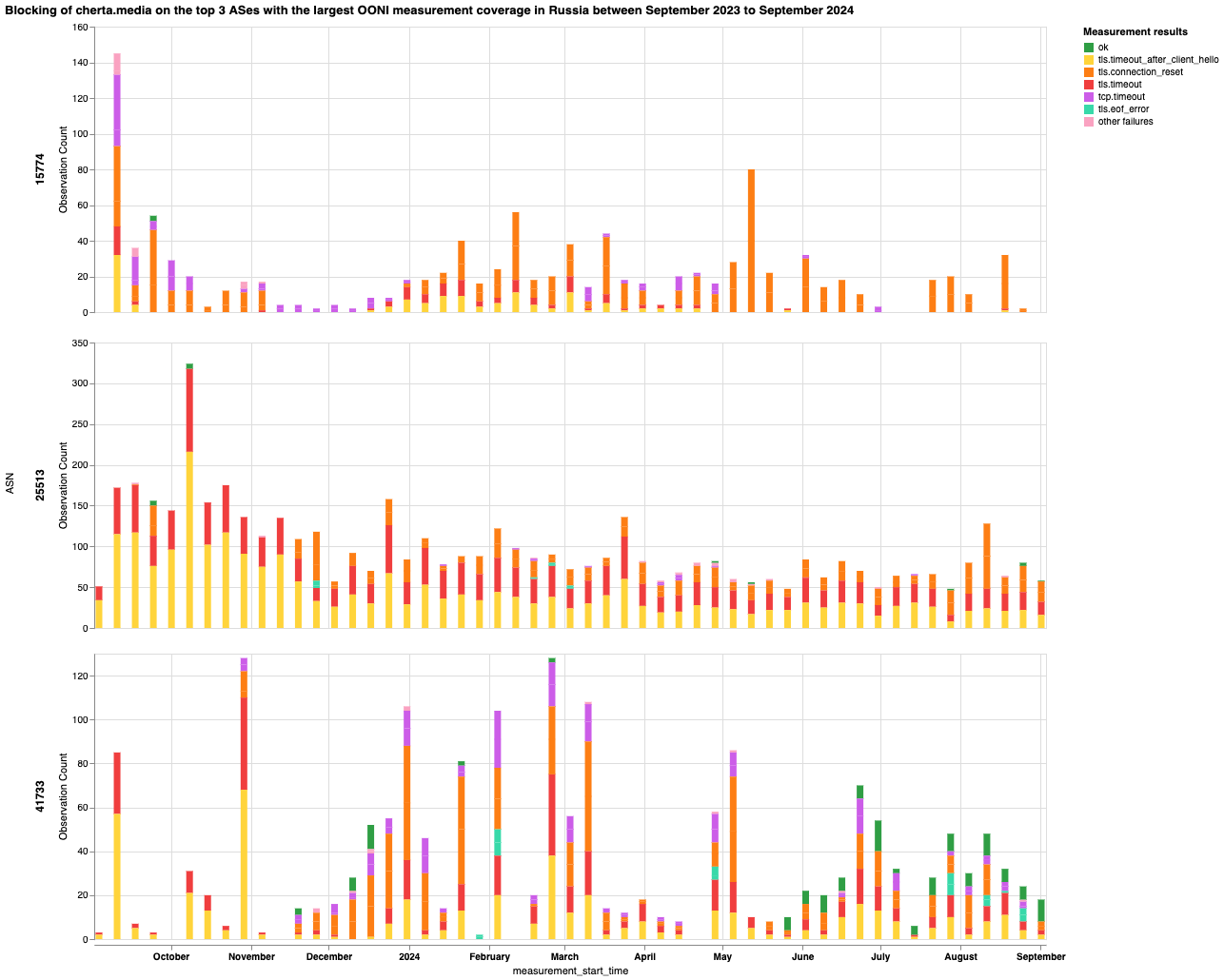 Мы агрегировали аномальные измерения, собранные в России, по типам сбоев («dns», «tcp_ip», «http-failure», «http-diff»), чтобы оценить, присутствуют ли они постоянно (или типы сбоев меняются), поскольку более последовательный тип сбоя, наблюдаемый в большом объеме измерений, дает более сильный сигнал блокировки. Далее мы проанализировали эти сбои для выявления специфических ошибок (таких как «connection_reset_error» или «generic_timeout_error»), которые позволили бы нам охарактеризовать потенциальную блокировку, и объединили ошибки для изучения того, совпадают ли они и в какой степени по всем (соответствующим) измерениям на каждой протестированной сети.