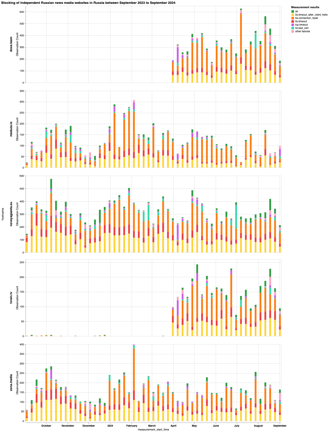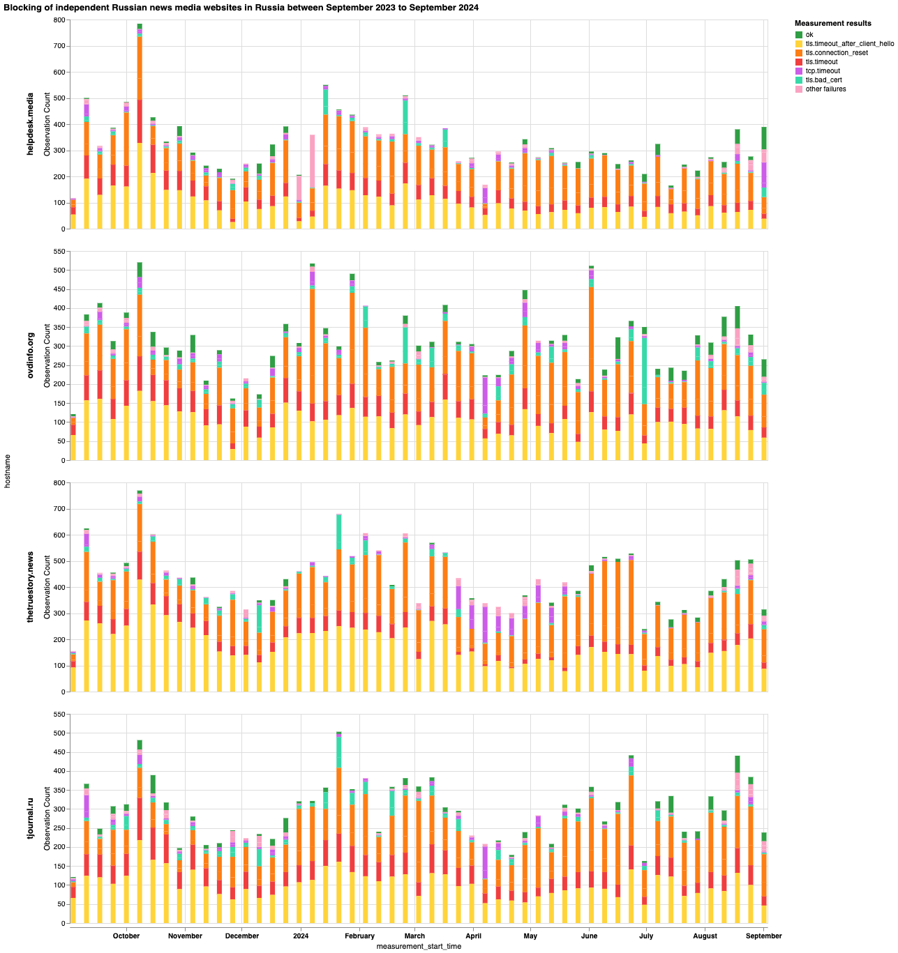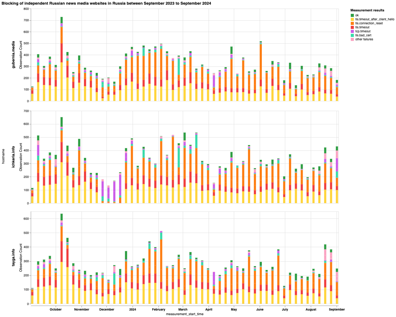 Наш анализ сетевых измерений OONI, собранных в России за последний год (с 1 сентября 2023 года по 1 сентября 2024 года), показывает: